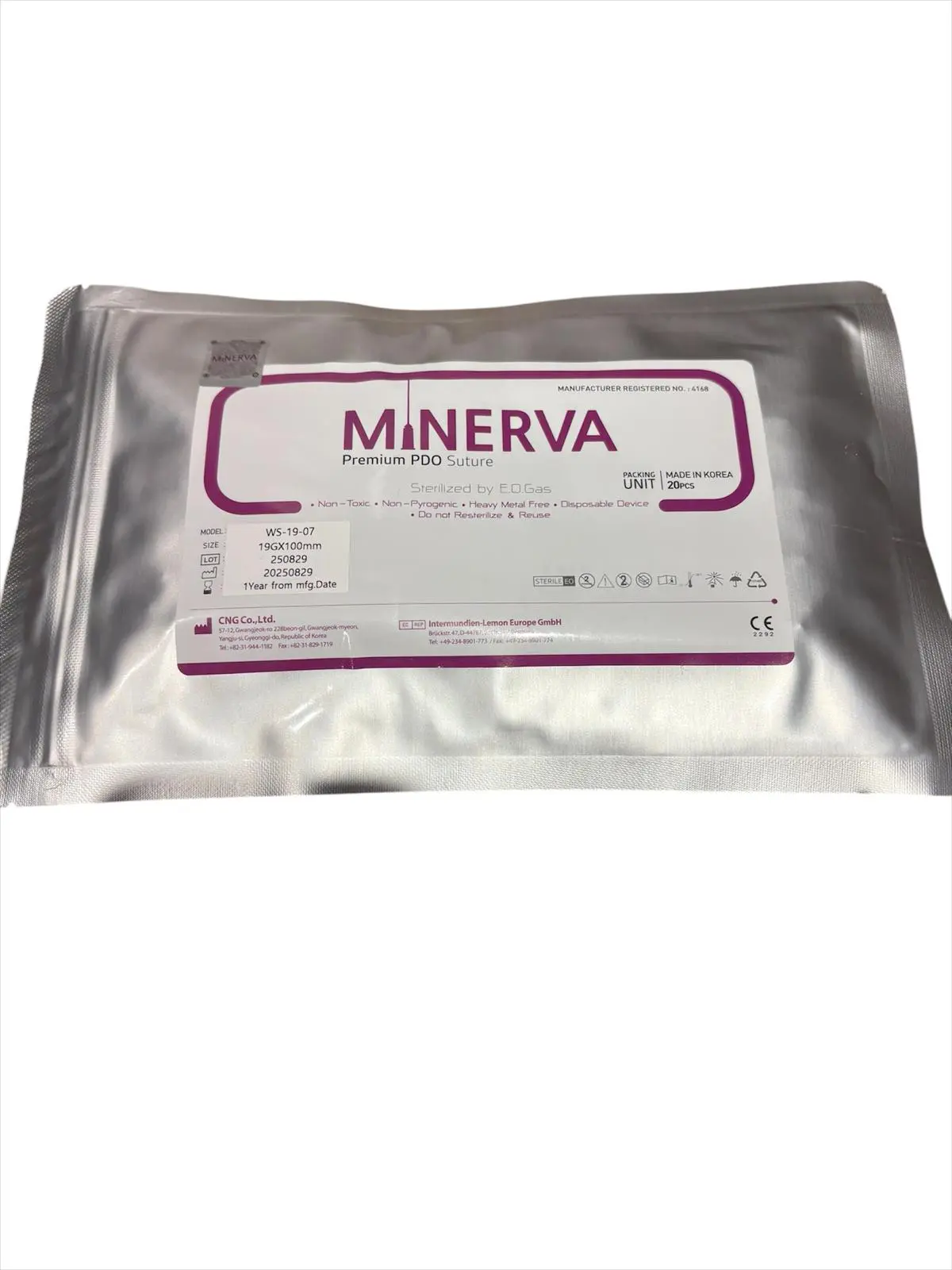 Minerva Premium PDO Suture 19G x 100mm is a high-quality absorbable thread designed for safe and effective non-surgical skin lifting and rejuvenation treatments. Made from medical-grade Polydioxanone (PDO), these sutures promote collagen production, improve skin firmness, and provide long-lasting aesthetic results. Each pack contains 20 sterile, individually sealed sutures for professional clinical use.
